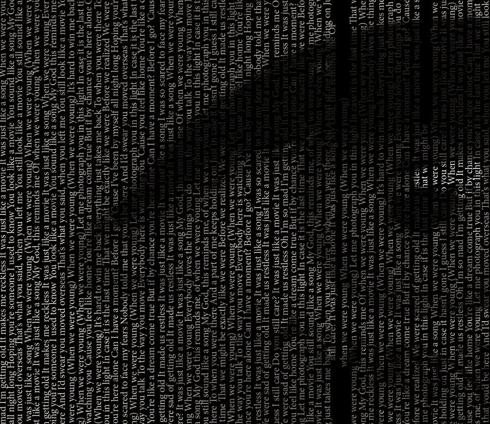 This is an exploration of sound. For this project, I wanted to explore sound in a visually different way using music. This sound wave is pulled from Adele's song “When We Were Young.” The sound wave comprises the song's lyrics (as seen in the second image). I then added her eyes to the wave because the eyes are sometimes considered the eyes of the soul, and music speaks the soul. The type is so small that it almost makes the image look like it is vibrating. In the printed version of this poster, there is a transparent varnish print of “when we were young” over the entirety of the poster. This adds more of that visual texture that I was going for.